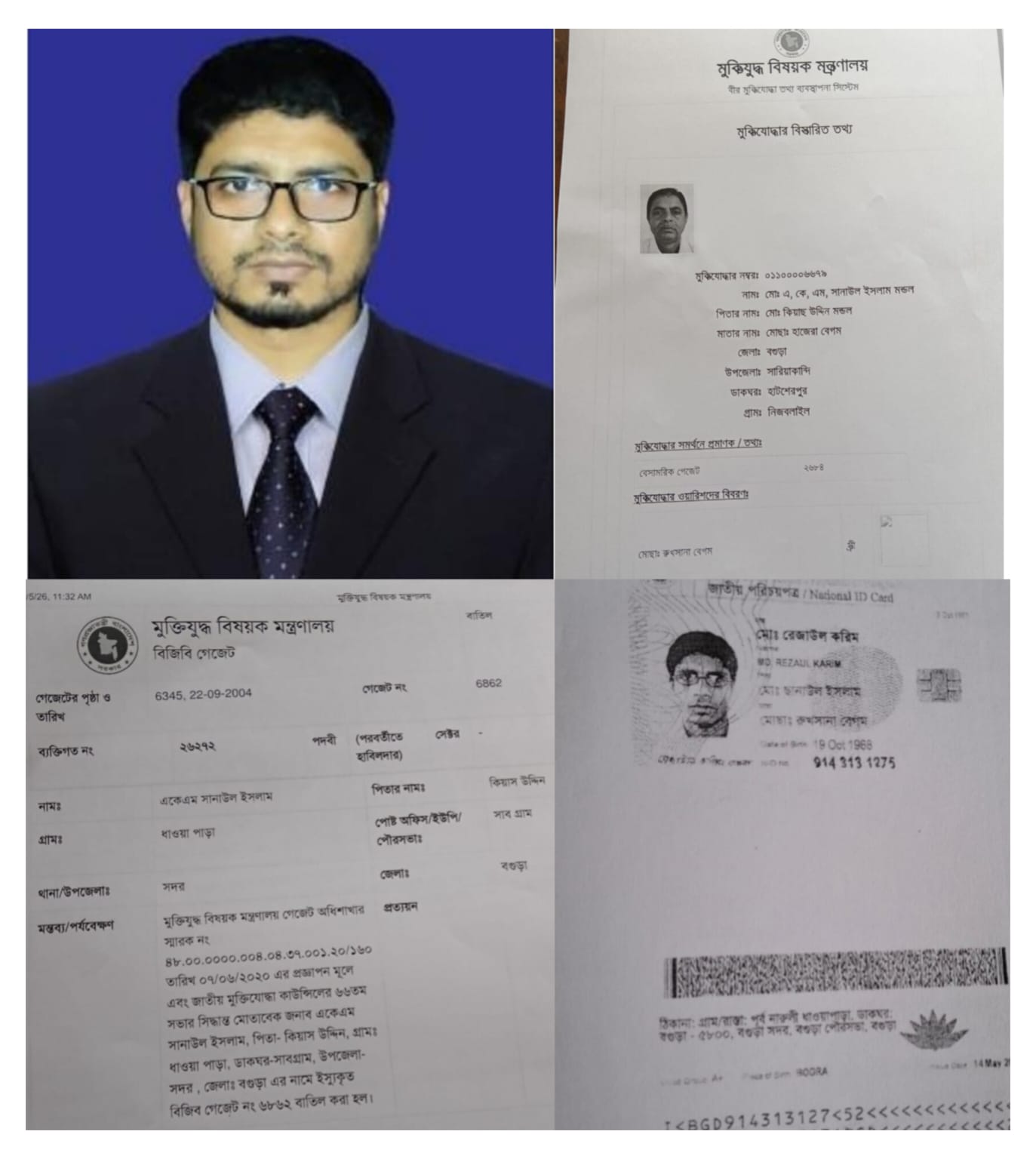 সব থেকে চমকপ্রদ বিষয়টি হলো জাতীয় পরিচয়পত্রে উল্লেখিত পিতার নাম, গ্রামের নাম, ডাকঘর, এমনকি উপজেলার নামের ও ব্যাপক পরিবর্তন দেখা যায় তার পিতার মুক্তিযোদ্ধা সনদে। এখন প্রশ্ন হলো কোনটির তথ্য সত্য, জাতীয় পরিচয় পত্রের নাকি পিতার মুক্তিযোদ্ধা সনদের? জাতীয় পরিচয় পত্রে রেজাউল করিমের পিতার নাম মোঃ ছানাউল ইসলাম, গ্রাম: পূর্ব-নারুলি ধাওয়াপাড়া, ডাকঘর: বগুড়া, উপজেলা: বগুড়া সদর হলেও বিজিবি গেজেটে বাতিল হওয়া তার পিতার মুক্তিযোদ্ধা সনদে পিতার নাম এ কে এম সানাউল ইসলাম, যেটির বিজিবি গেজেট নম্বর ৬৮৬২। মুক্তিযুদ্ধ বিষয়ক মন্ত্রণালয় এ গেজেটটিকে বাতিল বলে ঘোষণা করে। বিশ্বস্ত সূত্রে জানা যায় পাঁচ ছয় মাস সময় নিয়ে কাগজপত্র দাখিলের পর যে মুক্তিযোদ্ধা সনদ জমা দেন রেজাউল করিম তার বেসামরিক গেজেট নাম্বার ২৬৮৪, যেখানে তার পিতার নাম এ কে এম সানাউল ইসলাম মন্ডল, গ্রাম: নিজবলাইল, ডাকঘর: হাটশেরপুর, উপজেলা: সারিয়াকান্দি দেখানো হয়েছে। পরিচয় পত্রের তথ্য আর মুক্তিযোদ্ধা সনদের তথ্য প্রকৃতপক্ষে একটি গোলকধাঁধার জন্ম দিয়েছে। তবে কি তথ্য গোপন বা বিকৃত করেই সরকারি চাকরিতে বহাল তবিয়্যতে মোঃ রেজাউল করিম? অন্তবর্তী কালীন সরকারের আমলে মুক্তিযুদ্ধ কোটায় নিয়োগ প্রাপ্ত জনবলের তথ্য নেওয়া ও যাচাই করা বিষয়ে, মুক্তিযোদ্ধা কোটায় নিয়োগ প্রাপ্ত জনবলের পূর্ণাঙ্গ তথ্য প্রেরণ বিষয়ে নোটিশ প্রদান করা হলেও পিতার মুক্তিযোদ্ধা সনদের বিষয়ে উল্লেখ করেননি রেজাউল করিম বলে বিশ্বস্ত সূত্রে জানা যায়।চৌকস রেজাউল করিম প্রশাসন ও মন্ত্রণালয় কে সুকৌশলে ম্যানেজ করে অতিরিক্ত দায়িত্ব হিসেবে লালমনিরহাট টেক্সটাইল ইনস্টিটিউট,লালমনিরহাট এর অধ্যক্ষ পদ বাগিয়ে নিয়েছেন ইতিমধ্যে। সেখানেও নানা অনিয়ম দুর্নীতিতে জড়িয়ে পড়েন মোঃ রেজাউল করিম।