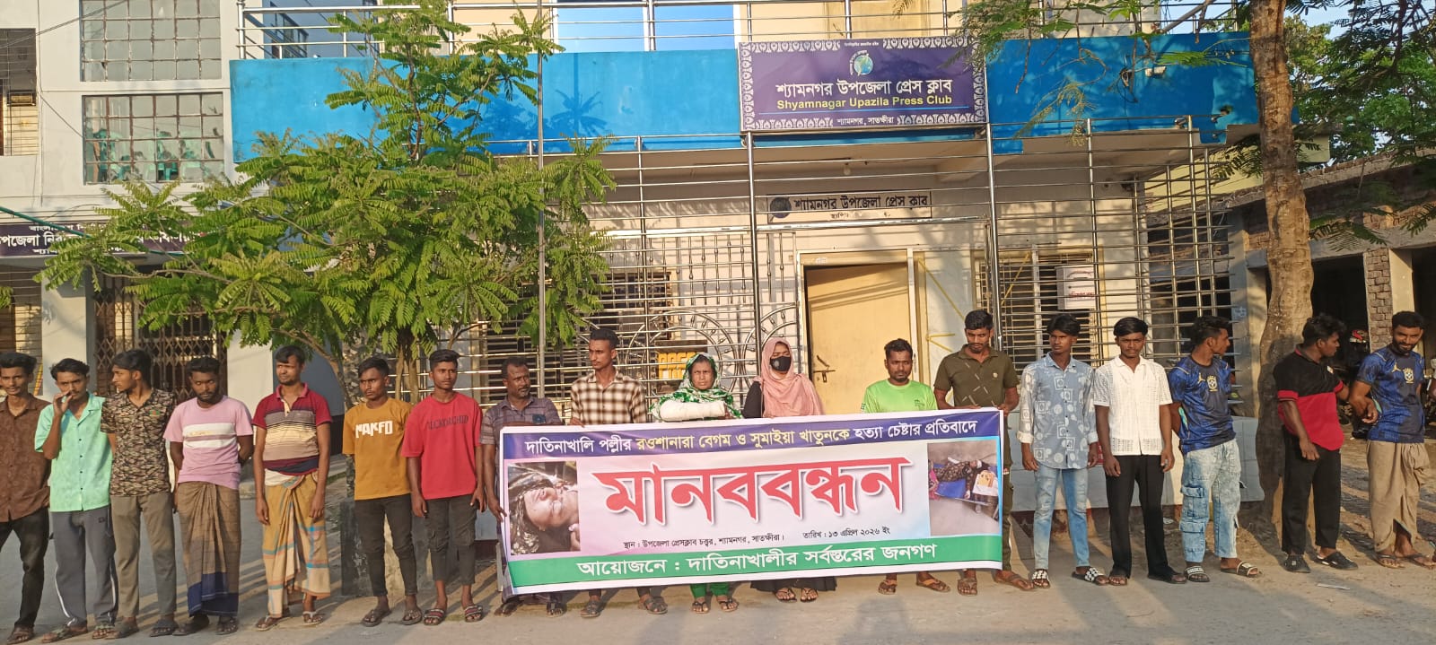 মোঃ আবু মুছা সরদার, শ্যামনগর (সাতক্ষীরা) প্রতিনিধি : শ্যামনগরের পল্লীতে রওশানারা ও সুমাইয়া খাতুন কে হত্যার চেষ্টা, মামলার ২নং আসামী কর্তৃক বাদী ও সাক্ষীদের জীবন্যাসের হুমকি দেওয়া সহ মামলা তদন্ত কর্মকর্তা মামলাটিকে ভিন্ন পথে প্রবাহিত করার চেষ্টার প্রতিবাদে মানববন্ধন অনুষ্ঠিত হয়। গত ১৪ এপ্রিল বিকালে শ্যামনগর উপজেলা প্রেসক্লাবের সামনে মানববন্ধনে আয়োজন করেন উপজেলার দাতিনা খালি গ্রামের জনগন। মানববন্ধনে বক্তব্য রাখেন আহত সুমাইয়া খাতুন ও রওশানার। সুমাইয়া বলেন সম্প্রতি শ্যামনগর উপজেলার দাতিনা খালি গ্রামের মৃত লতিফ মোড়লের পুত্র পিরামিন ইসহাক, নুরুল আমিনের পুত্র রাজু আহমেদ,রনি,ও রাকিব হোসেন ঝুমুর, দেশীয় অস্ত্র নিয়ে রওশানারা ও সুমাইমাকে নিশংস ভাবে মারপিট করে। এ ঘটনায় রওশনারার দুই হাত ও মাথায় রক্তাক্ত যখন ও হাড় ভেঙে যায়। এ ঘটনায় রওশনারা বাদী হয়ে শ্যামনগর থানায় আসামিদের বিরুদ্ধে ০৮/৮৫ নং মামলা করে। মামলার দুই নং আসামী তদন্ত কর্মকাকে মোটা অংকের টাকায় ম্যানেজ করি প্রকাশ্যে ঘুরে বেড়াচ্ছে। ২ নং আসামি জামিন না দিয়ে প্রকাশ্যে ঘুরে বেড়াচ্ছে এবং বাদী ও সাক্ষীদের জীবন নাশের হুমকি দিচ্ছে। অপরদিকে তদন্ত কর্মকর্তা মামলাটিকে ভিন্ন পথে প্রবাহিত করার চেষ্টা করছে। এ ঘটনায় মানববন্ধনে জেলা পুলিশ সুপারের হস্তক্ষেপ কামনা করেছেন।