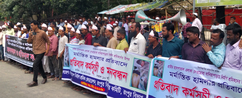 মানববন্ধন ও প্রতিবাদ সমাবেশ হতে জানা যায়, গত ১১ এপ্রিল পৃথক দুই ঘটনায় নির্মাণ শ্রমিকদের ওপর সন্ত্রাসী হামলা চালানো হয়েছে, যা অত্যন্ত নিন্দনীয় ও উদ্বেগজনক। নগরীর প্রাইম মেডিকেল কলেজ হাসপাতালের সামনে একটি নির্মাণাধীন ভবনে কাজ করার সময় শ্রমিকদের কাছে চাঁদা দাবি করে। শ্রমিকরা চাঁদা দিতে অস্বীকৃতি জানালে তাদের ওপর হামলা চালানো হয়। এতে কয়েকজন শ্রমিক আহত হন।
