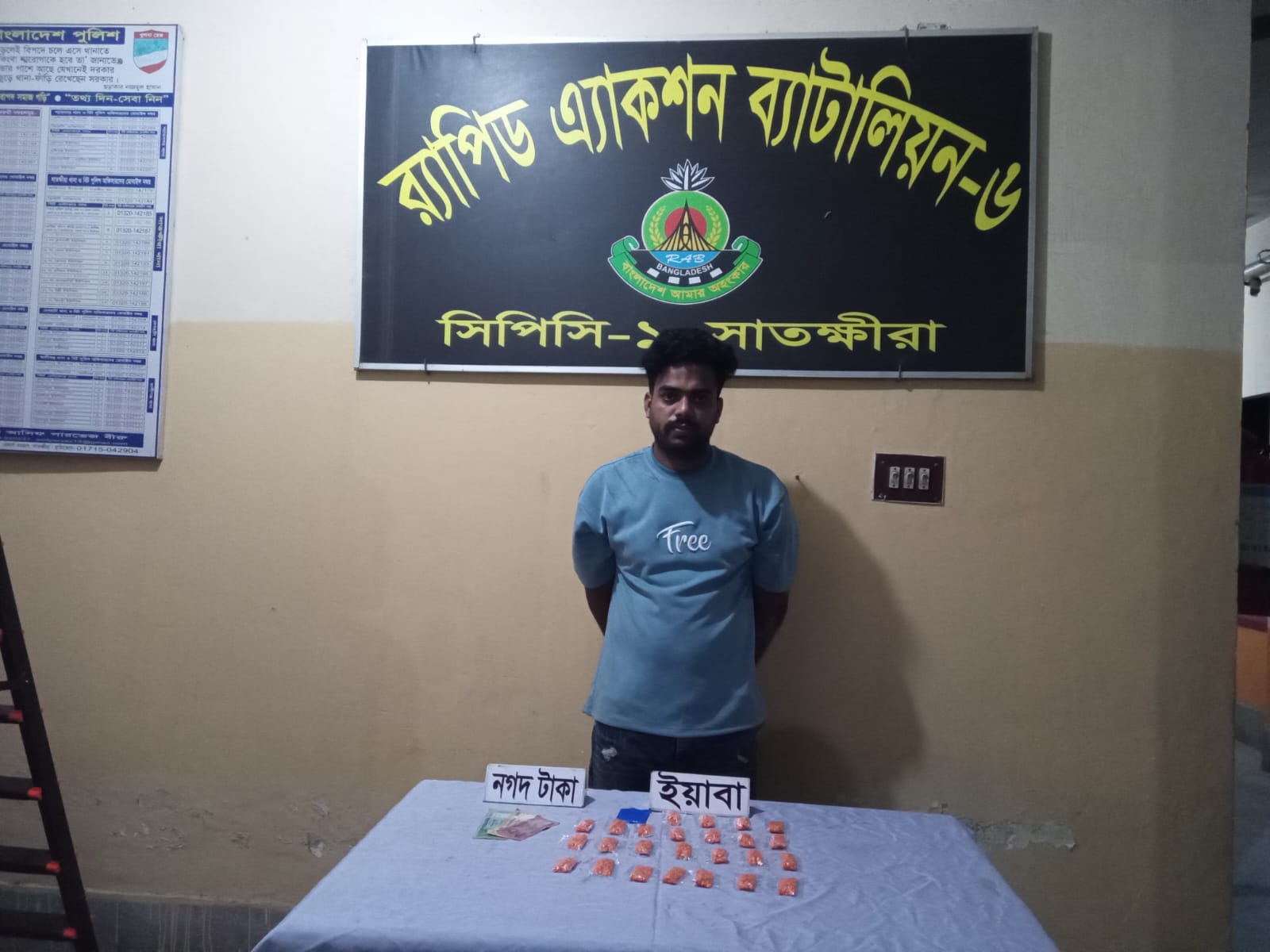 আরিফুল ইসলাম সাতক্ষীরা : সাতক্ষীরা শহরের পলাশপুল (মধুমালার ডাংরি) এলাকায় অভিযান চালিয়ে ২৫২০ পিস ইয়াবাসহ ইয়াসিন আরাফাত নামে এক কুখ্যাত মাদক ব্যবসায়ীকে আটক করেছে র‍্যাপিড অ্যাকশন ব্যাটালিয়ন (র‍্যাব)। গতকাল ১৭ এপ্রিল, ২০২৬ তারিখ দিবাগত রাত আনুমানিক ২ টায় গোপন সংবাদের ভিত্তিতে র‍্যাবের একটি আভিযানিক দল ওই এলাকায় অভিযান পরিচালনা করে। দীর্ঘ দিন ধরে নজরদারিতে থাকা মাদক সম্রাট ইয়াসিন আরাফাতকে নিজ আস্তানায় মাদক বেচাকেনার সময় হাতেনাতে আটক করা হয়।