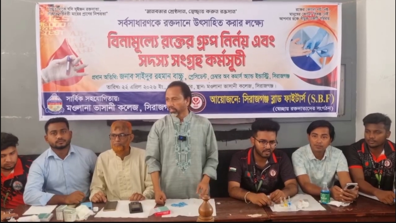 জাহিদুল হক, সিরাজগঞ্জ : সামাজিক মানবিক সংগঠন সিরাজগঞ্জ ব্লাড ফাইটার্স এর উদ্যোগে বিনামূল্যে রক্তের গ্রুপ নির্ণয় ও সদস্য সংগ্রহ কর্মসূচি অনুষ্ঠিত হয়েছে। বুধবার (২২ এপ্রিল ২০২৬) সিরাজগঞ্জের মাওলানা ভাসানী কলেজ প্রাঙ্গণে এ কর্মসূচির আয়োজন করা হয়।