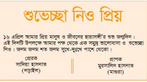 প্রেরক : সাদিয়া হাসনাত (নড়াইল) ১৬ এপ্রিল আমার প্রিয় মানুষ ও জীবনের ছায়াসঙ্গী'র শুভ জন্মদিন। এই দিনটি উপলক্ষে আমার পক্ষ থেকে এক সমুদ্র ভালোবাসা ও শুভেচ্ছা নিও। জনম জনম…
